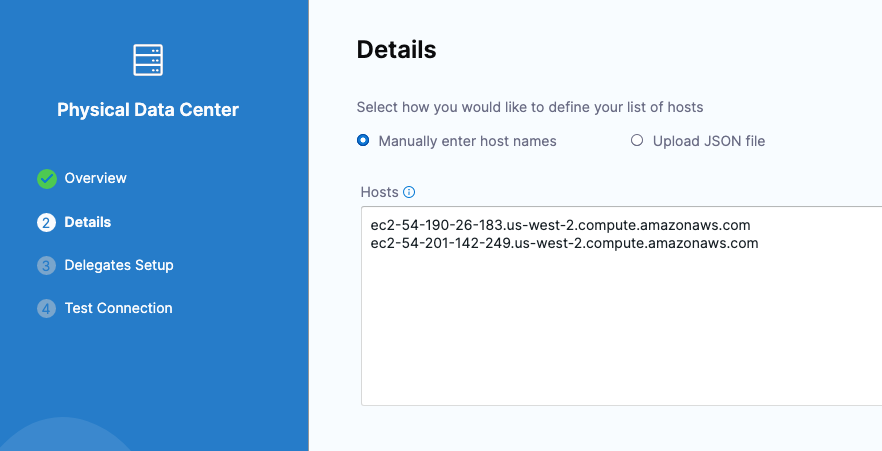 The Specify hosts or Select preconfigured hosts from Physical Data Center options are used when you are deploying to a pre-existing infrastructure.