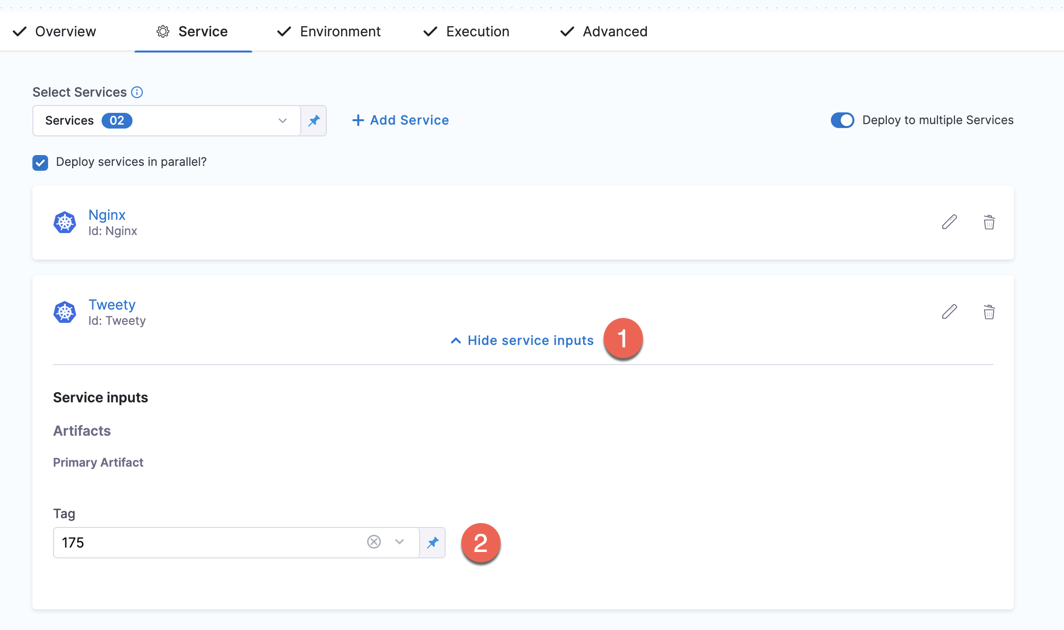Often, you will deploy one service to one Environment in a CD stage. In some cases, you might want to use multiple services and environments in the same stage.