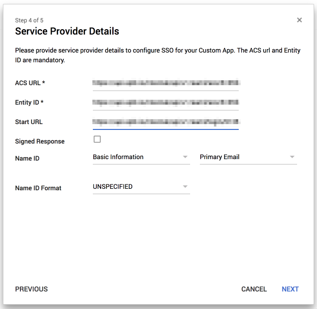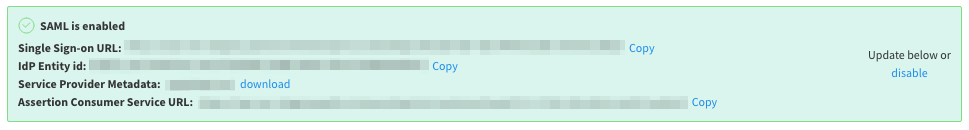 When you save these changes, you can view the summary of the SAML configuration parameters. You use this information when adding SAML settings in Google.