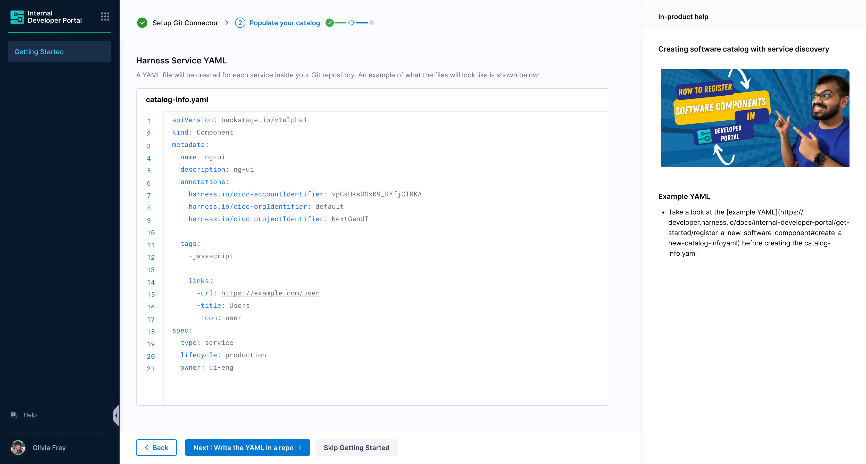 Since during the onboarding flow Harness will not be able to discover the complete metadata of the entity, the owner field will be set to Unknown. As part of the IDP provisioning, Harness users and groups are imported to IDP. With this in place, customers can start editing the catalog info YAML definition to update the owner for each of the entity.