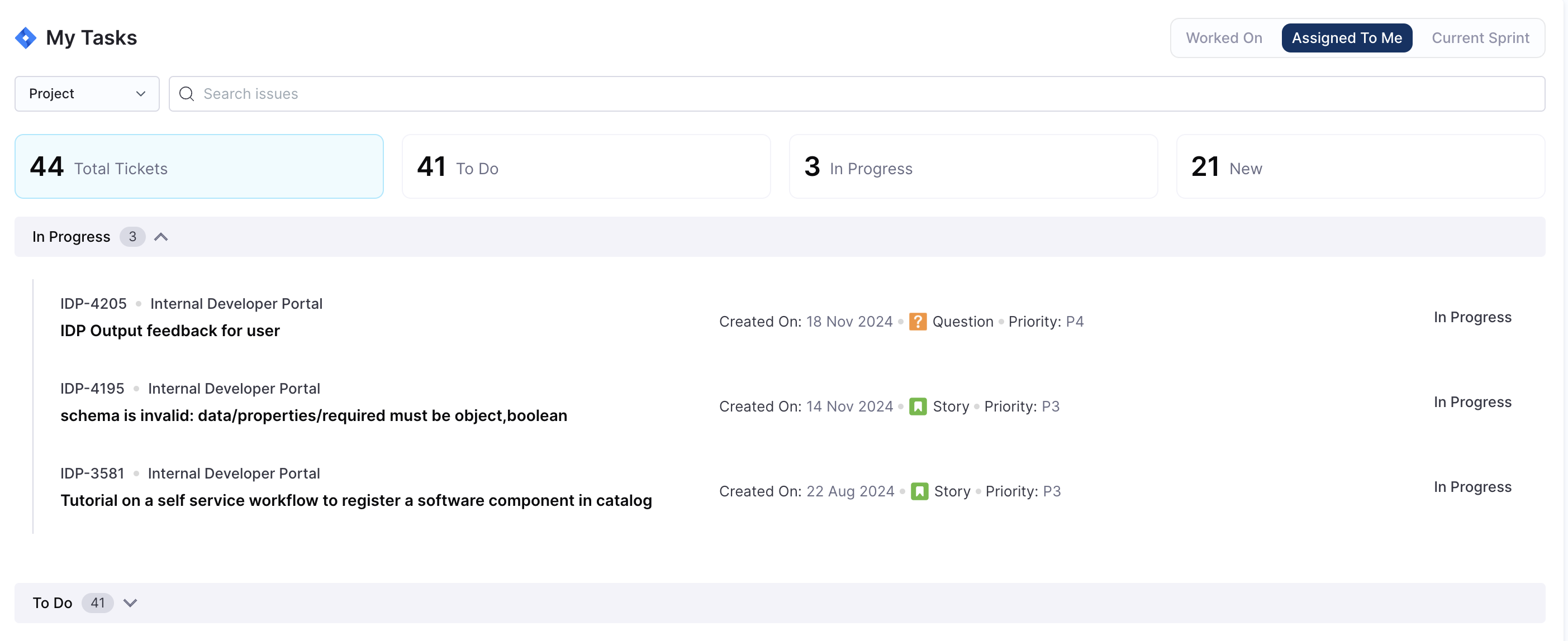 Project: The project the task belongs to (e.g., Internal Developer Portal).