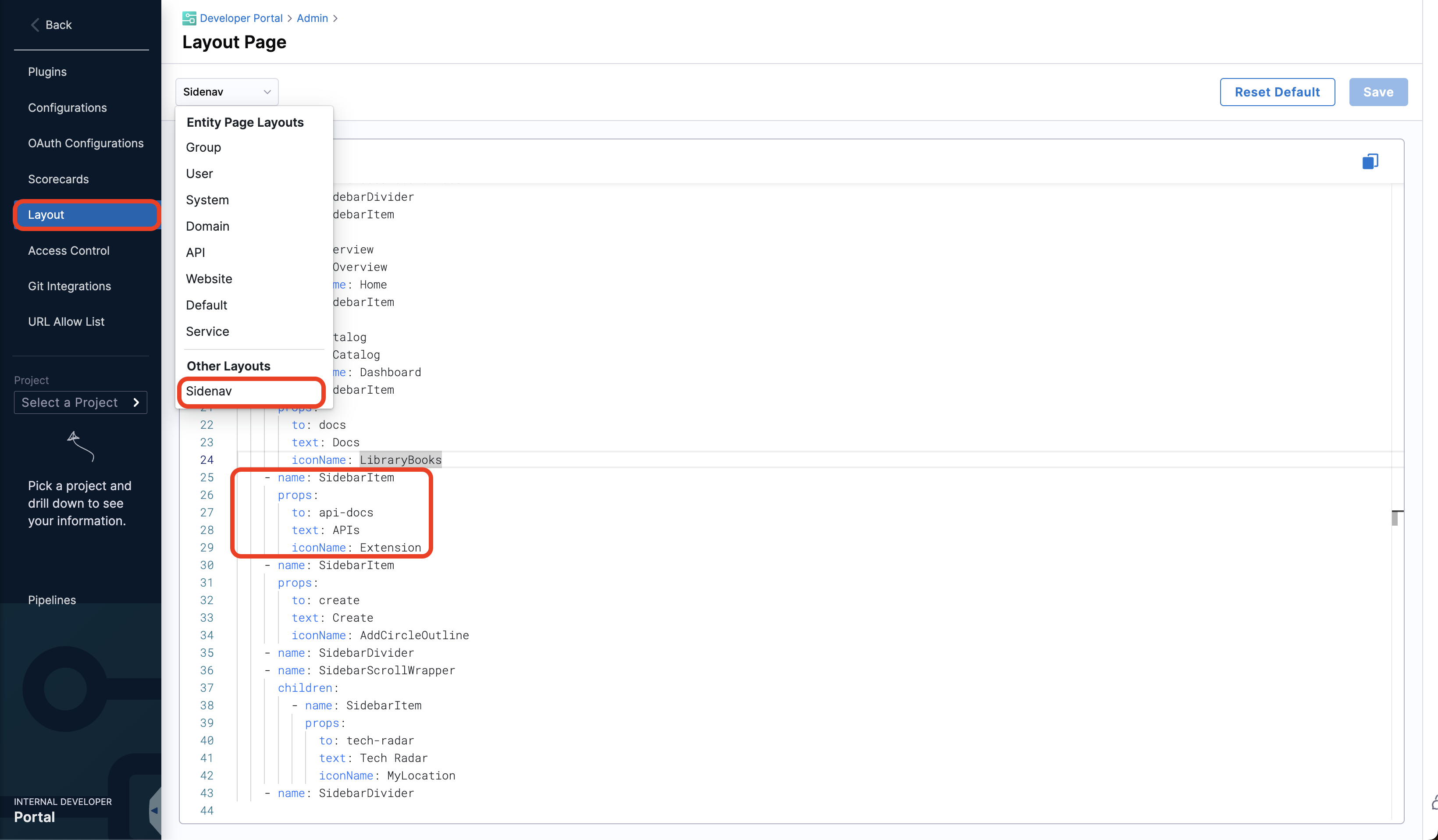 - Once the plugin is Enabled, to add it in your Sidenav as shown in the image go to the Layout under Admin.