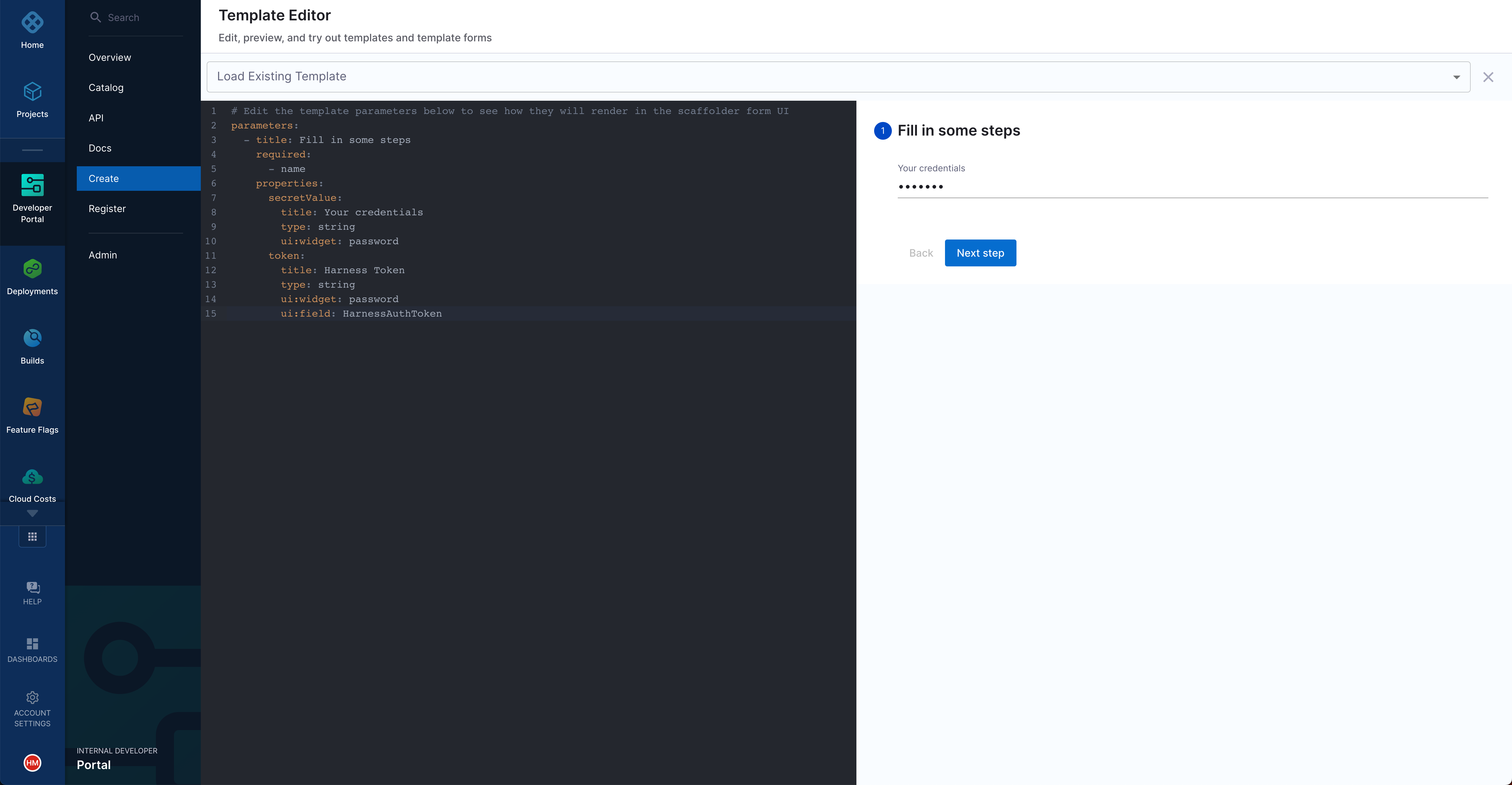 Use the harness:create-secret action in a step in the workflow.yaml file to create a Harness secret from the developer's input. The following step creates a secret in the specified project, so make sure that the project contains the service onboarding pipeline in which you plan to reference the secret: