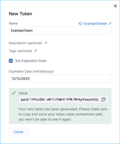 warningThe token is only displayed once. Store the token somewhere secure that you can access when you make API requests.